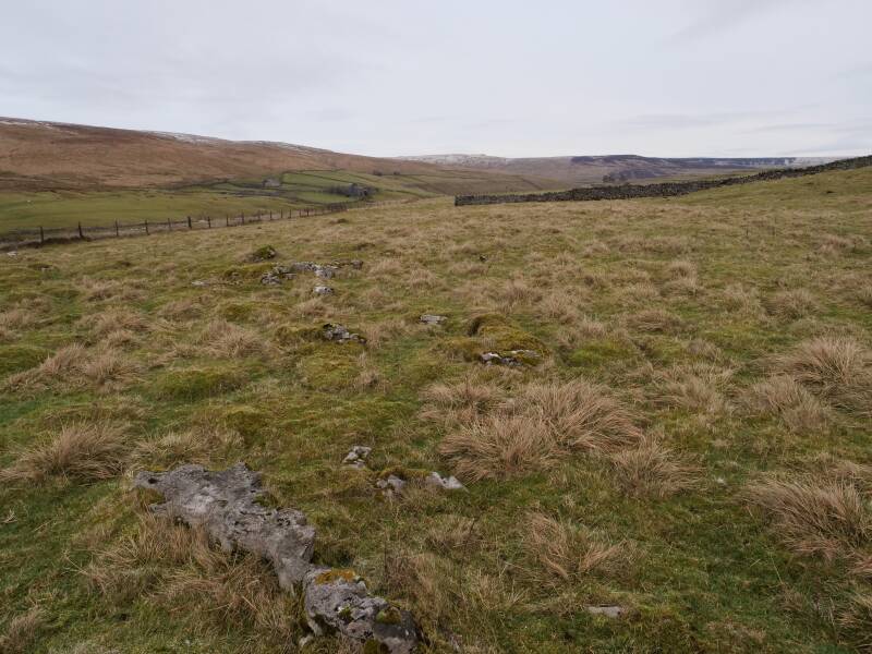 Photo below: an again different view of the possible new archaeological site looking towards Littondale, again showing a part of an ovalar arrangement of bank and larger stones, in this photo below, visible as a line of stones in the field that heads away from the bottom centre of the image, and to the central mid left of the image.