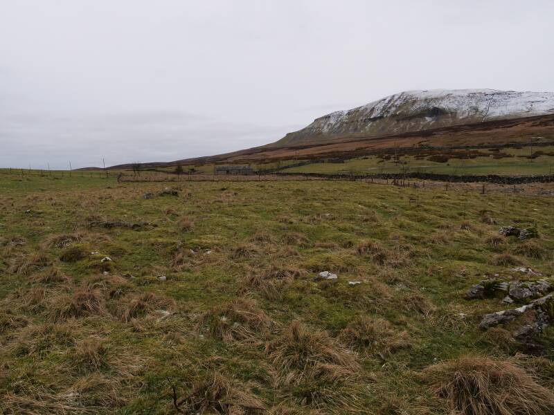 Photo below: another photo showing the possible new archaeological site near to the Halton Gill Giant's Graves. This is, again, separate from known settlement and ancient enclosure sites in this immediate area. Pen-Y-Ghent can be seen rising and capped in snow on the right of the image. A rough ovalar shape can also be seen in the field where the photo is taken, as a part of the possible new archaeological site. I do not think this shape is natural, and it is one of several in this field and at this site. Note how both earth and somewhat larger stones seem to form this ovalar shape. This is also unrelated to the ship-shaped burial sites I have discussed elsewhere, including in the blog post before this blog post on this page. The ovalar shape in the photo below can be seen heading around the bottom centre of the image on both sides, and off into the further reaches of the site.