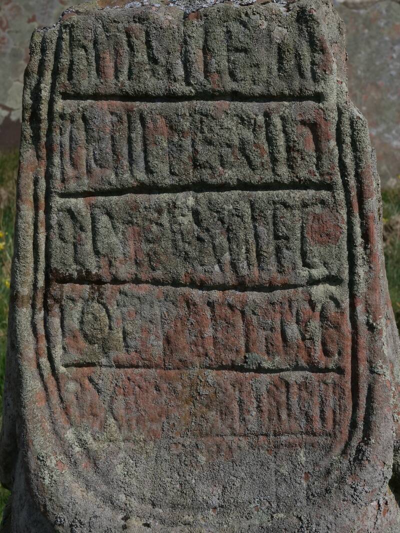 Photo below: a close-up of the Beckermet Cross Inscription. Note how some of the letters are identifiable & similar to letters of the Latin alphabet, whilst other letters resemble Latin letters, but not quite enough to be completely sure of them. Other letters do not really resemble Latin letters in any absolute sense.