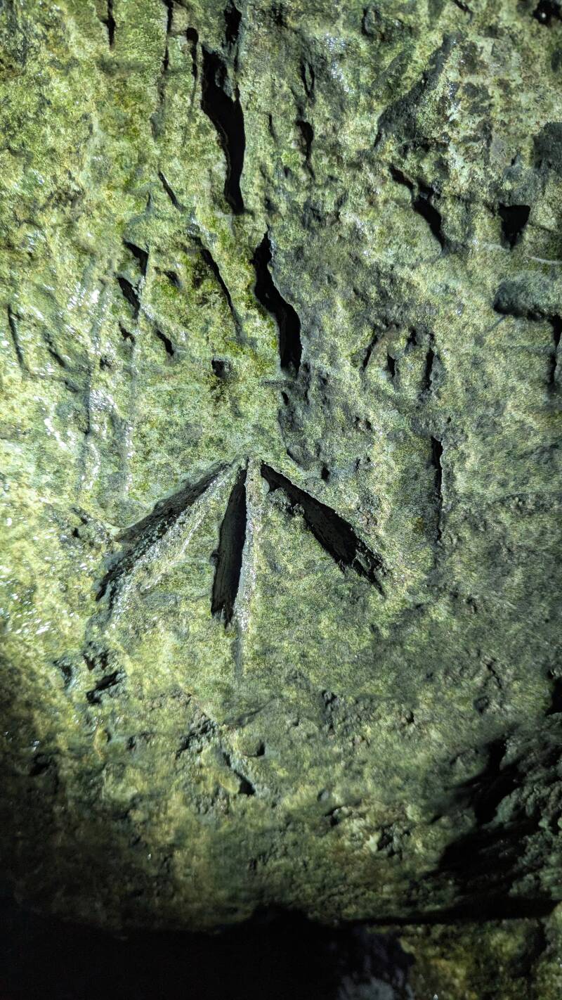 Photo below: a clear marking within the cave which resembles the "Awen Symbol", although it also resembles several so-called "masons' marks" found on old stonework. This marking is perhaps the clearest in the cave, and it is located not too far inside the cave.