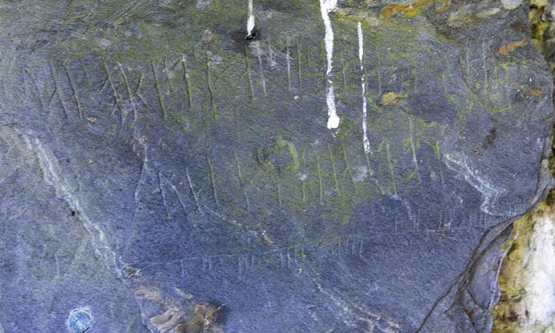 Photo below: a somewhat worse-for-ware looking Maughold Stone, as photographed in summer 2016, bird droppings had sadly obscured parts of the runic inscriptions. On the upper part of the stone can be seen the first runic inscription on the Maughold Stone, below which is the second runic inscription, and below which is the Ogham inscription. As you can see, the photograph below shows these inscriptions, but is not akin to my better, more recent photos of inscriptions where I use side-lighting. Of course I could not have done this in the daytime when I was at Maughold because it was too light. Maughold in the Manx language by the way is Maghal, pronounced approximately as [maxal]. Below the photo below I will go on to explain the runic inscriptions on the Maughold Stone.